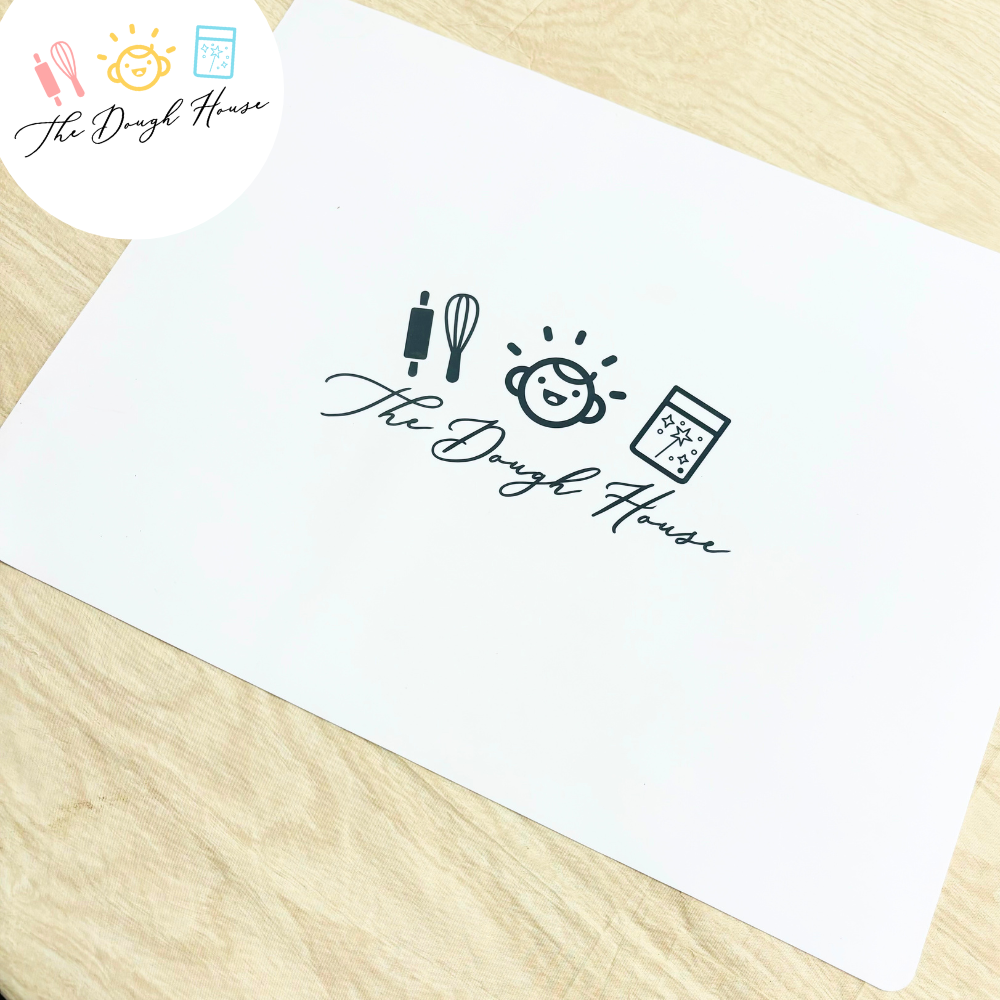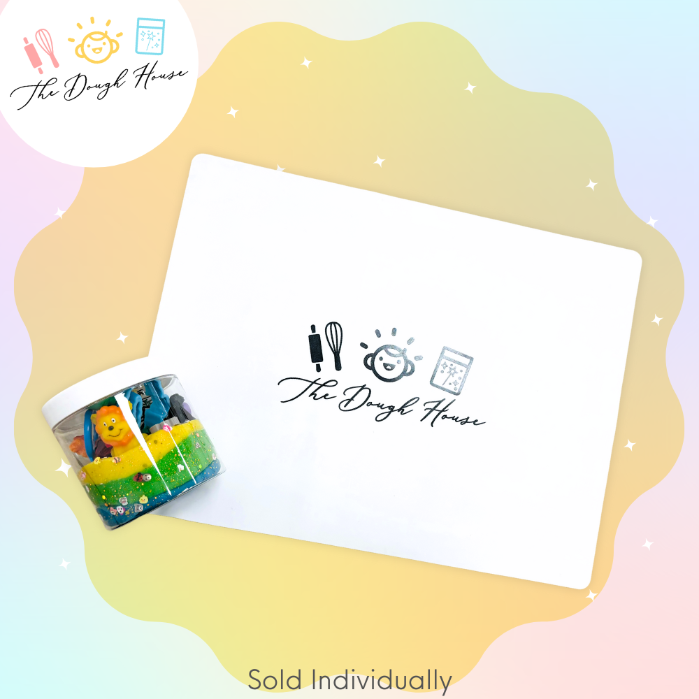 WHITE placemat with Dough House logo For use with sensory dough No minimums, order individually as needed. Placemat is silicone, 16 x 12in. Each piece is individually wrapped with logo & barcode Retail $12 each The perfect accessory for sensory dough, and a great addition to your store's sensory display. These items are silicone, so they are food safe for helping in the kitchen as well! Customers will be excited to have a placemat to keep their table clean (and help establish a play area)