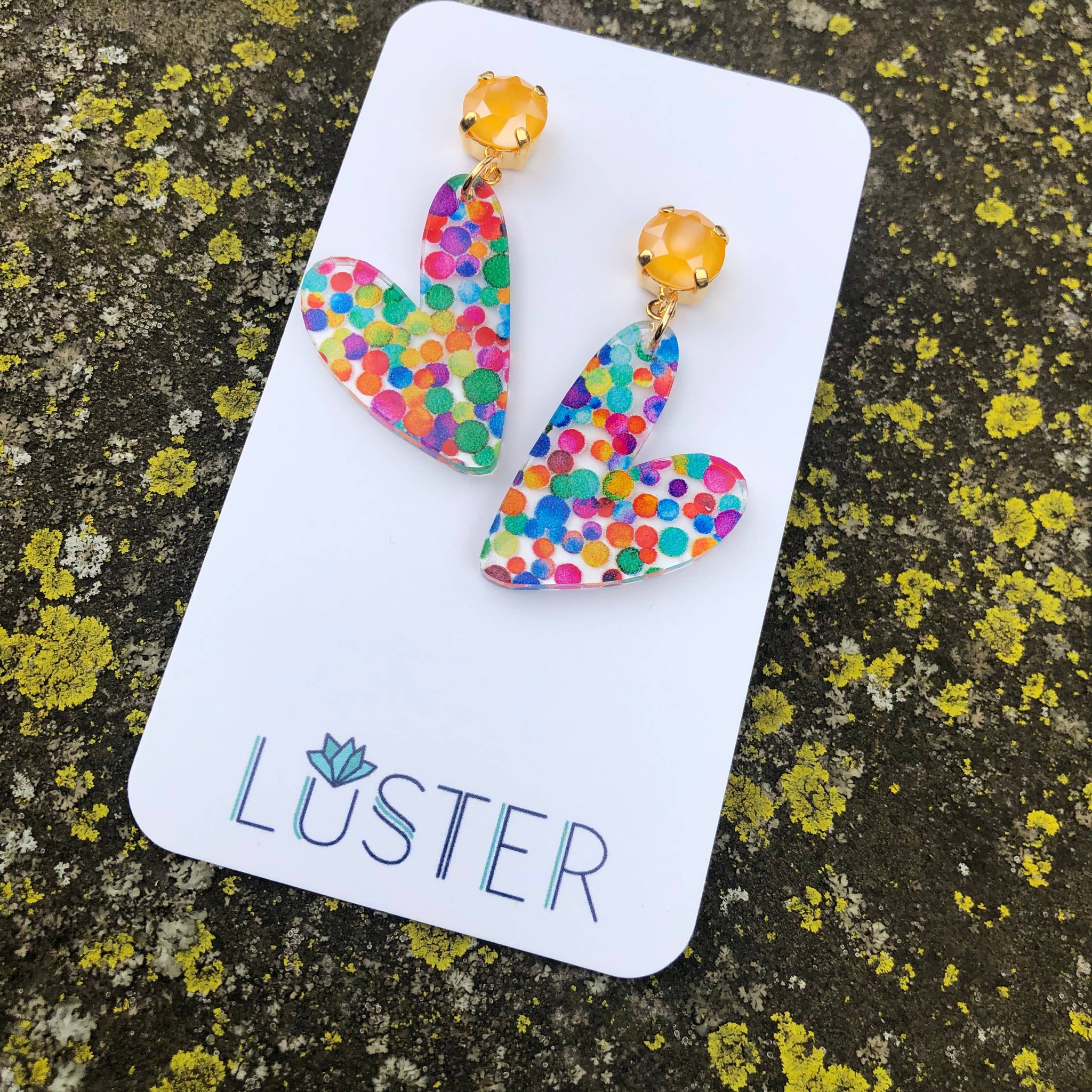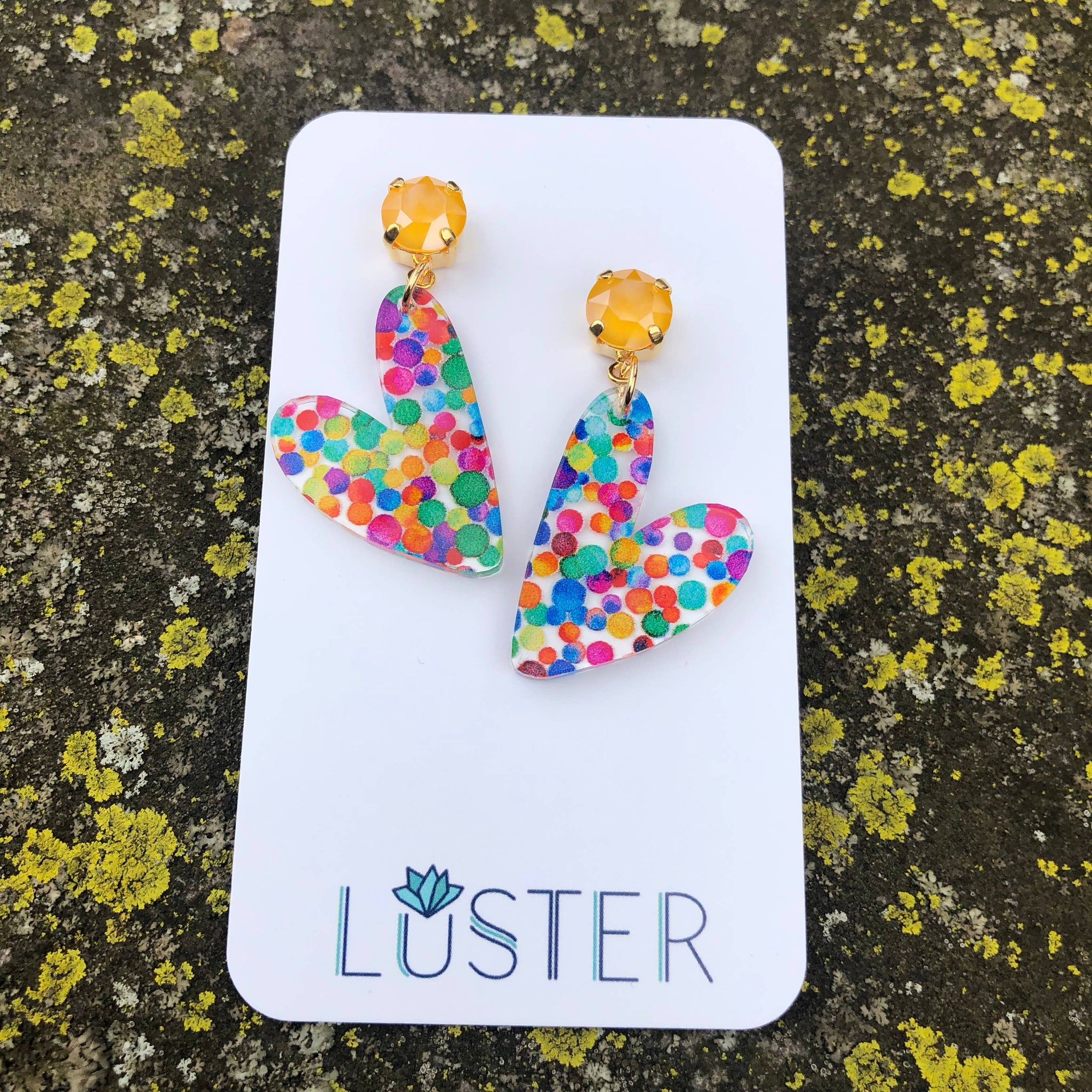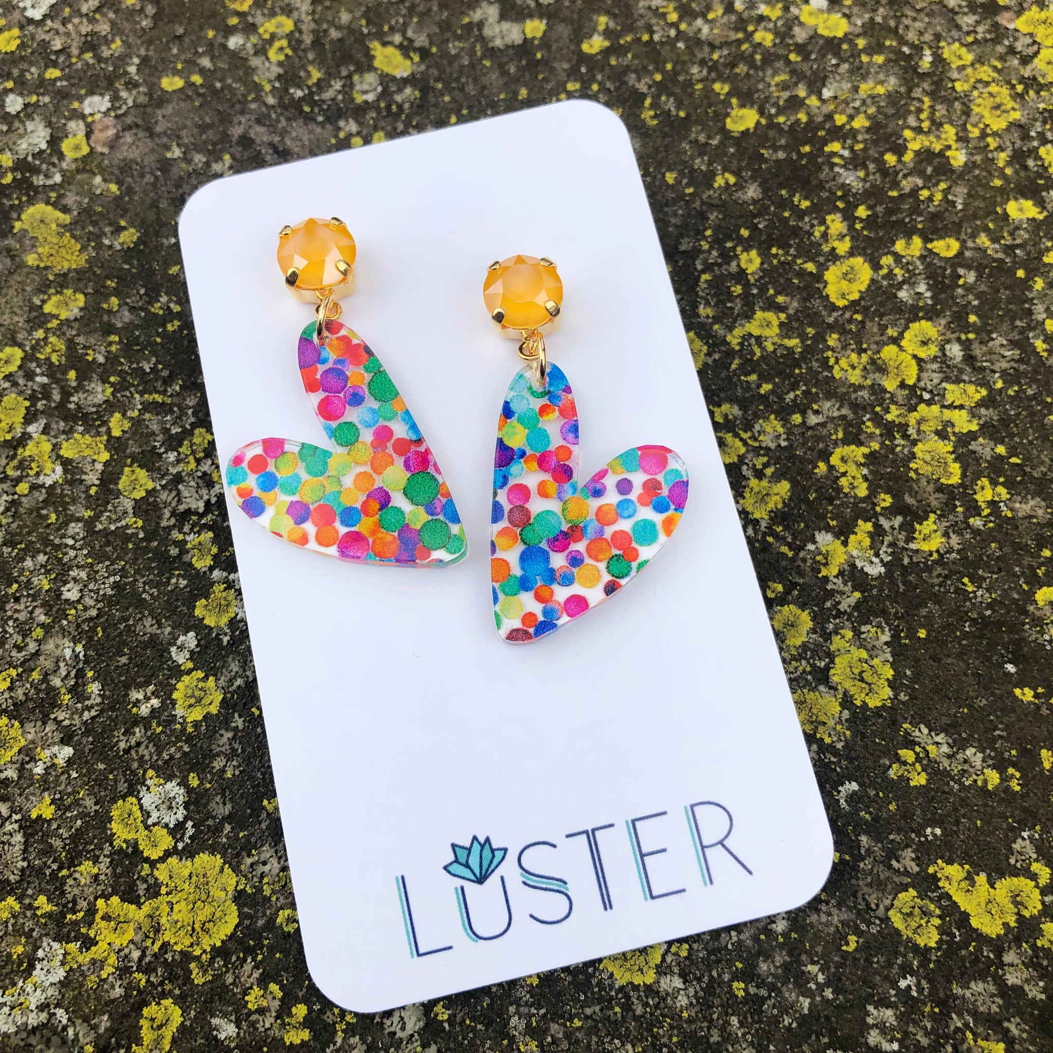 The ultimate party earrings! Adorable off-set confetti hearts with happy yellow Austrian crystal accents. Nickel-free plated brass studs.