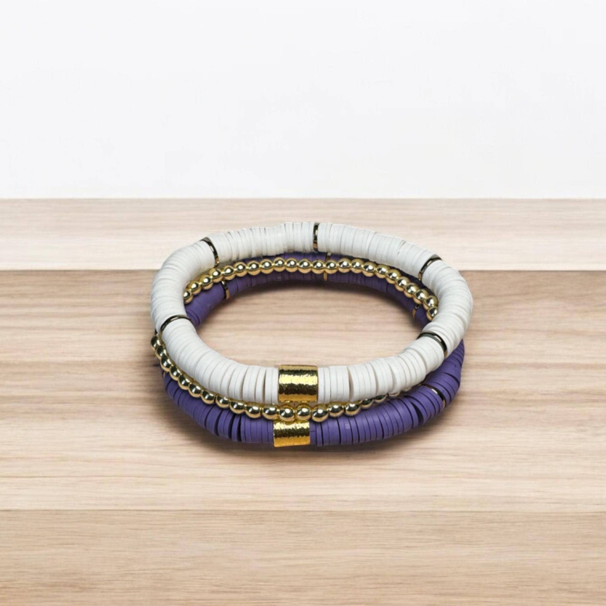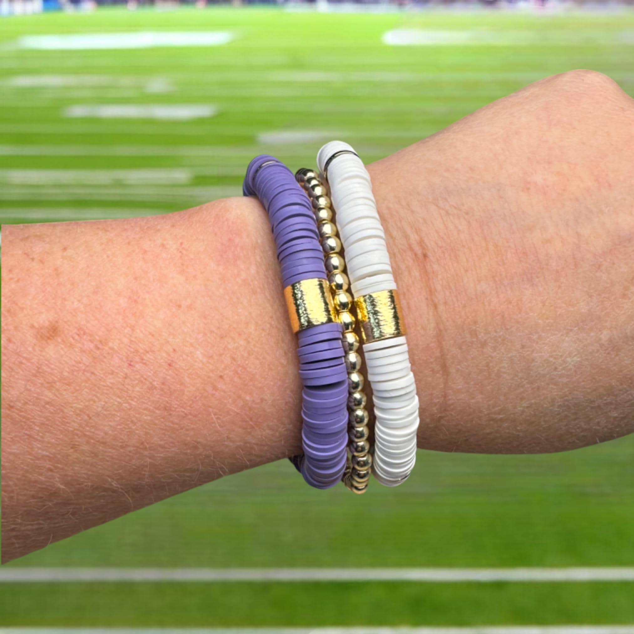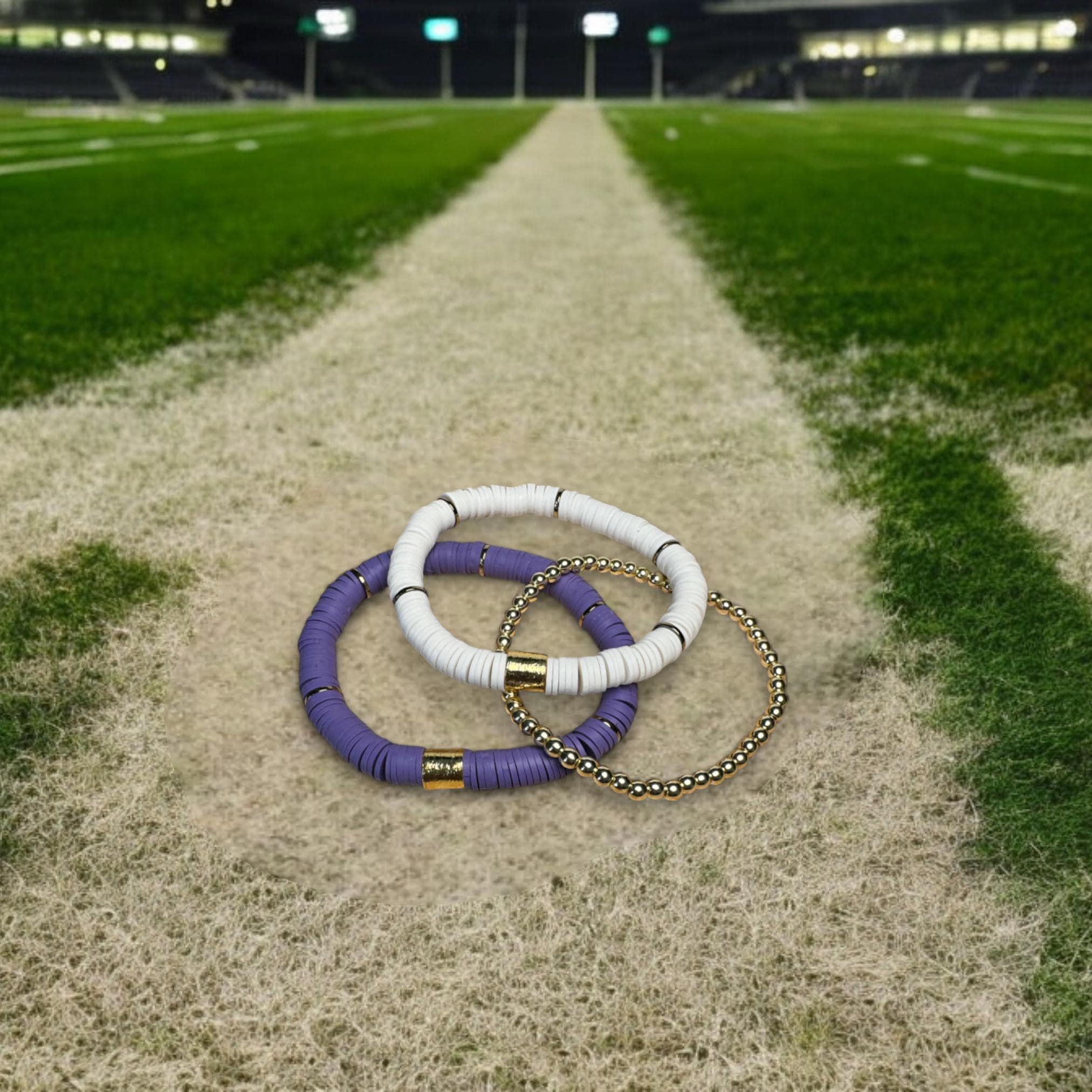 Get ready to show your team spirit with our game day bracelet stack. It features set 2 Heishi bead bracelets and one gold bead bracelet and is perfect for game day or any casual outing. This bracelet stack features purple and white Heishi beads, complemented by a single elegant gold bracelet, adding a touch of sophistication to the sporty look. Whether you're cheering from the stands or watching the game from home, these bracelets are a stylish way to showcase your favorite team colors.