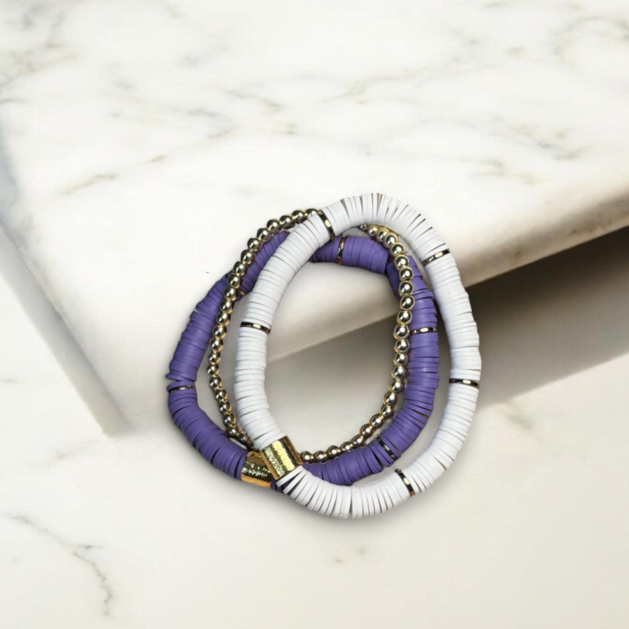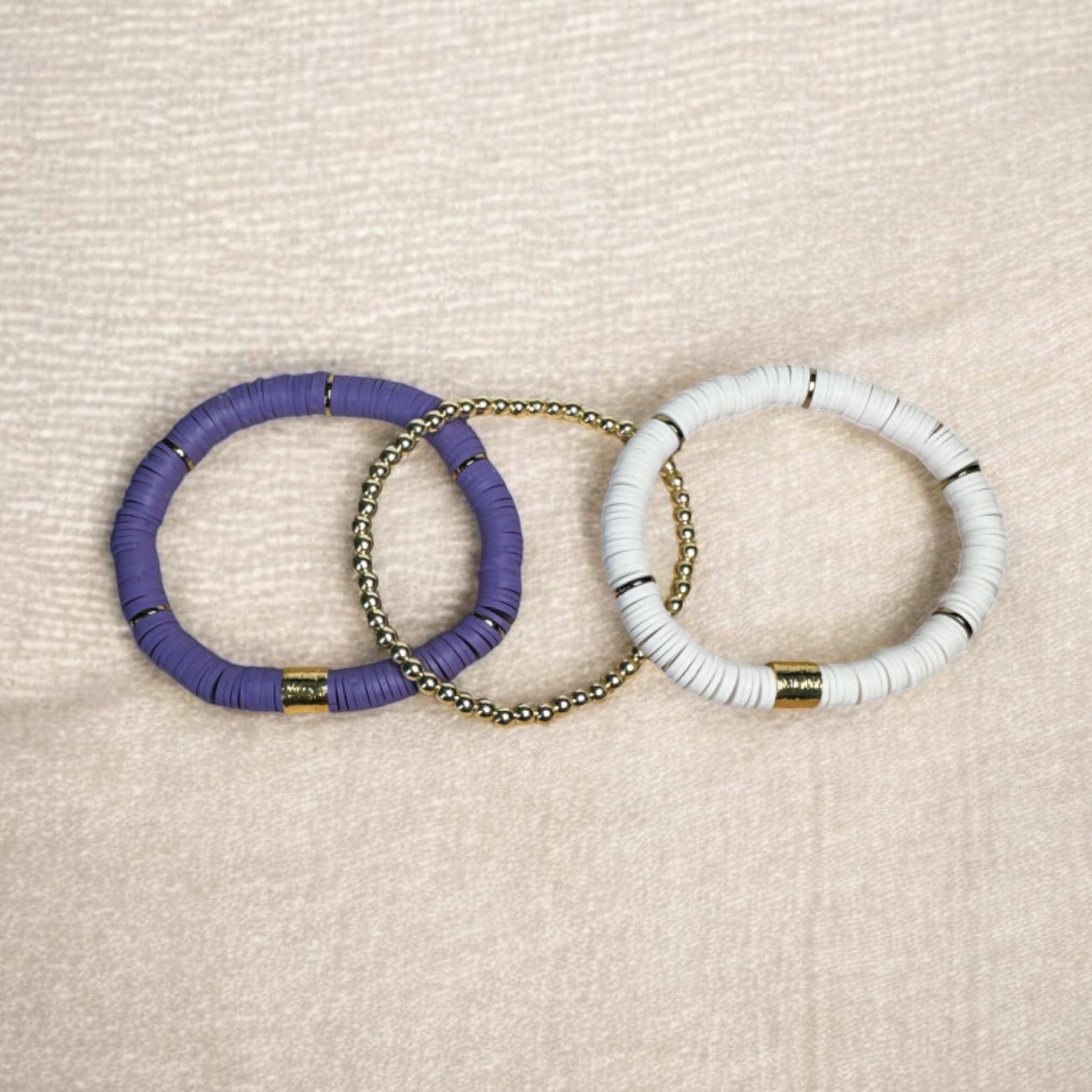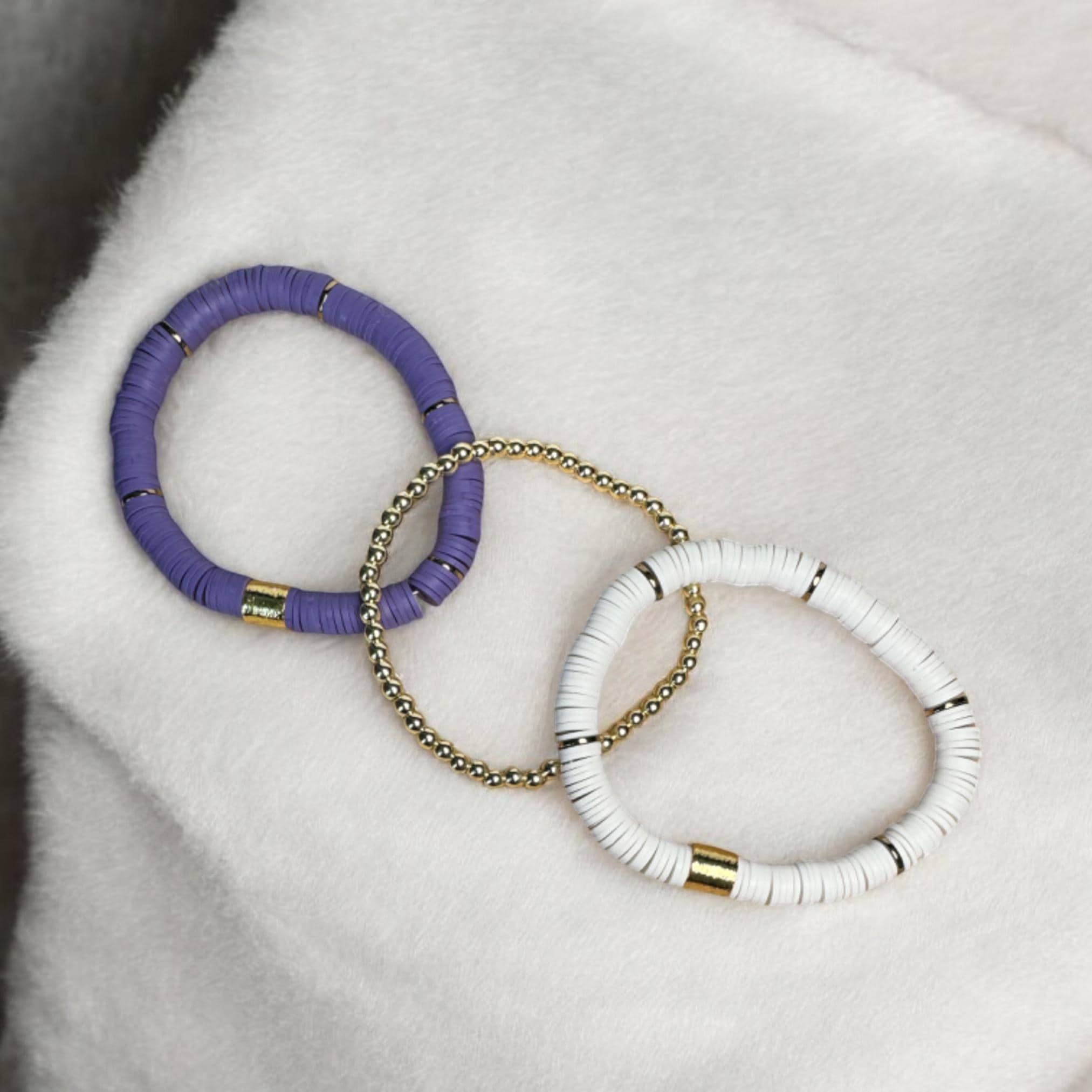 Get ready to show your team spirit with our game day bracelet stack. It features set 2 Heishi bead bracelets and one gold bead bracelet and is perfect for game day or any casual outing. This bracelet stack features purple and white Heishi beads, complemented by a single elegant gold bracelet, adding a touch of sophistication to the sporty look. Whether you're cheering from the stands or watching the game from home, these bracelets are a stylish way to showcase your favorite team colors.