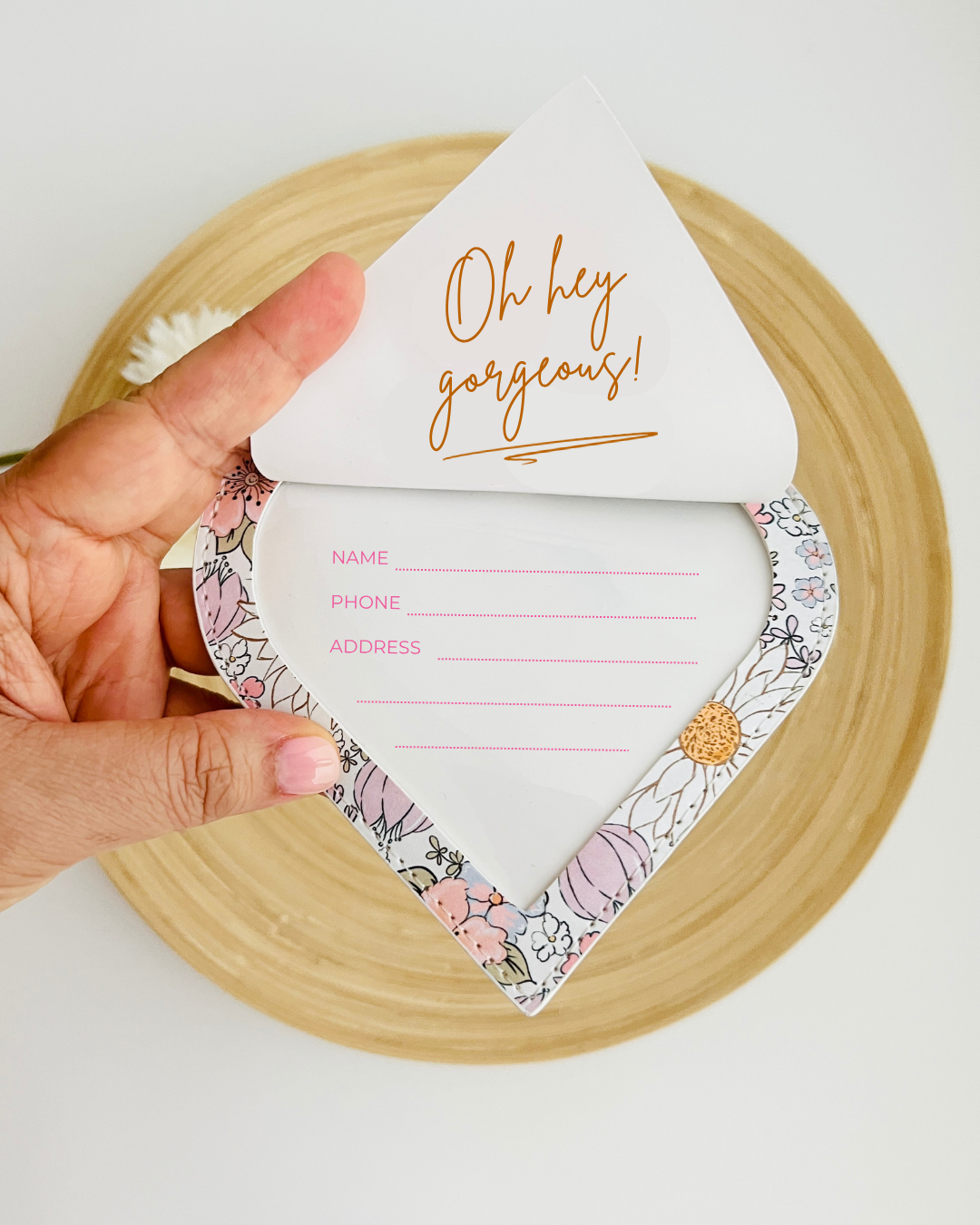 The vegan leather heart-shaped luggage tag is such a special little add to your shop! Inside the flap, it says "Oh Hey, Gorgeous!"