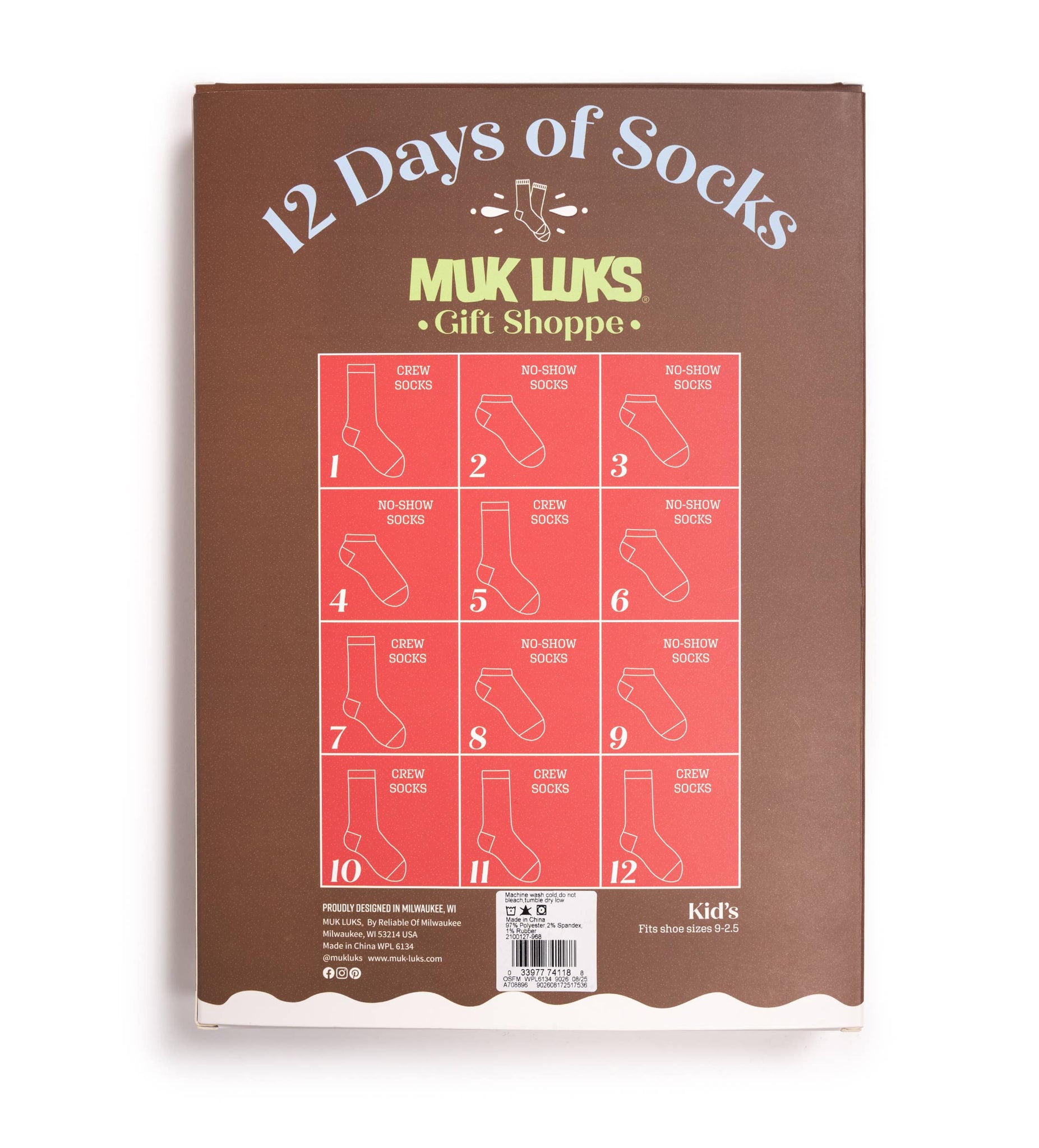 Gift your kids in your life 12 pairs of MUK LUKS cozy socks for the holidays. This advent assortment includes 6 pairs of crew socks and 6 pairs of no-show socks, all in fun and festive patterns..